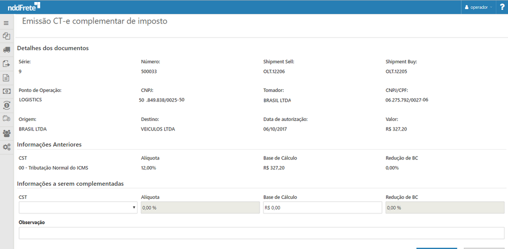 Ao clicar em complementar imposto será direcionado para a tela de emissão de CT-e complementar de imposto, para que possa complementar as infomações: