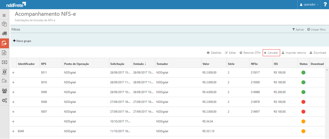localizada acima da grid, possibilita o processo de cancelamento de NFS-e.