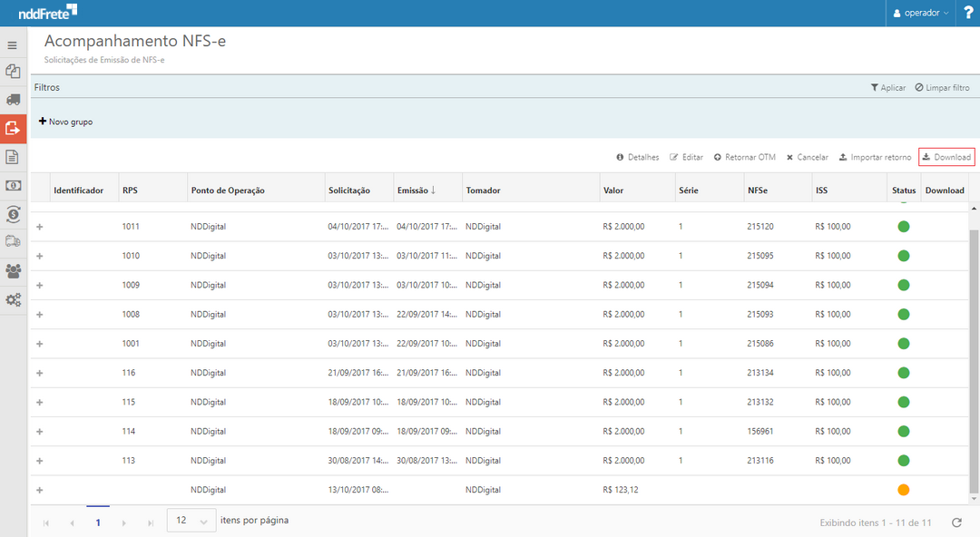 localizada acima da grid, permite realizar o download do RPS, para ser enviado manualmente para prefeitura, caso esta não possua web service.