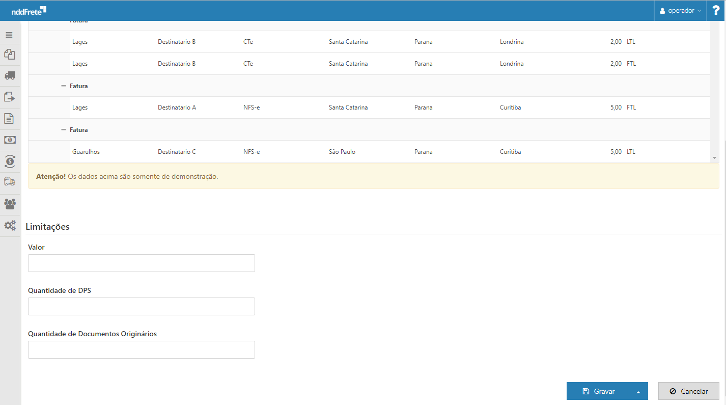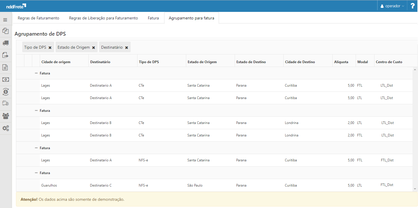 Com intuito de proporcionar maior organização e clareza no processo, o nddFrete disponibiliza dados demonstrativos, pré-cadastrados, para os DPSs faturáveis que irão compor a mesma fatura, na fase em faturamento.
