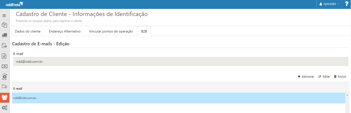A guia “Cliente” contém as principais informações de todos os contratantes de serviços logísticos, cadastrados no nddFrete.