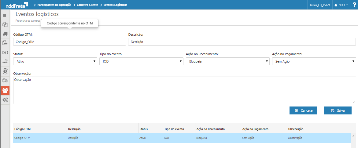 •Código OTM: Deve ser informado o XID do evento no OTM;