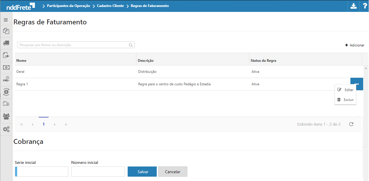 Nesta tela é possivel, adicionar, editar e excluir regras de faturamento automatico;