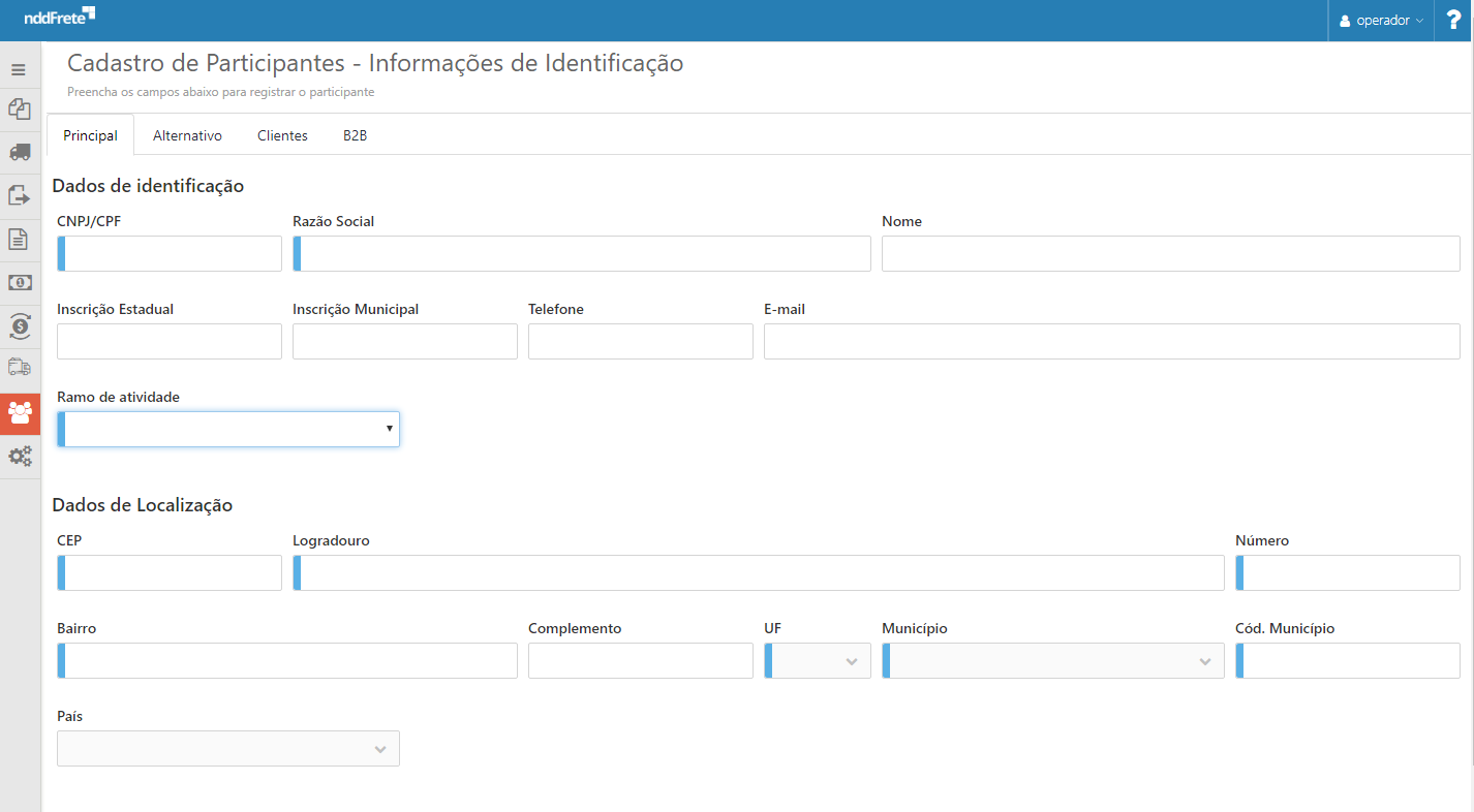 Para acessar a guia Cadastro de Participante navegue entre os menus: Principal>Participantes da Operação>Cadastro Participante