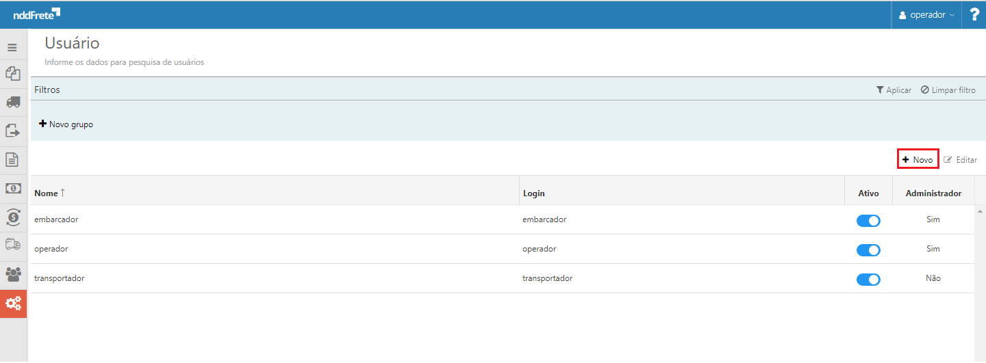Ao selecionar Aplicação "Transportador" não será possível torna-lo administrador. Somente Aplicações do tipo "Operador", "Embarcador" podem ser administradores. |