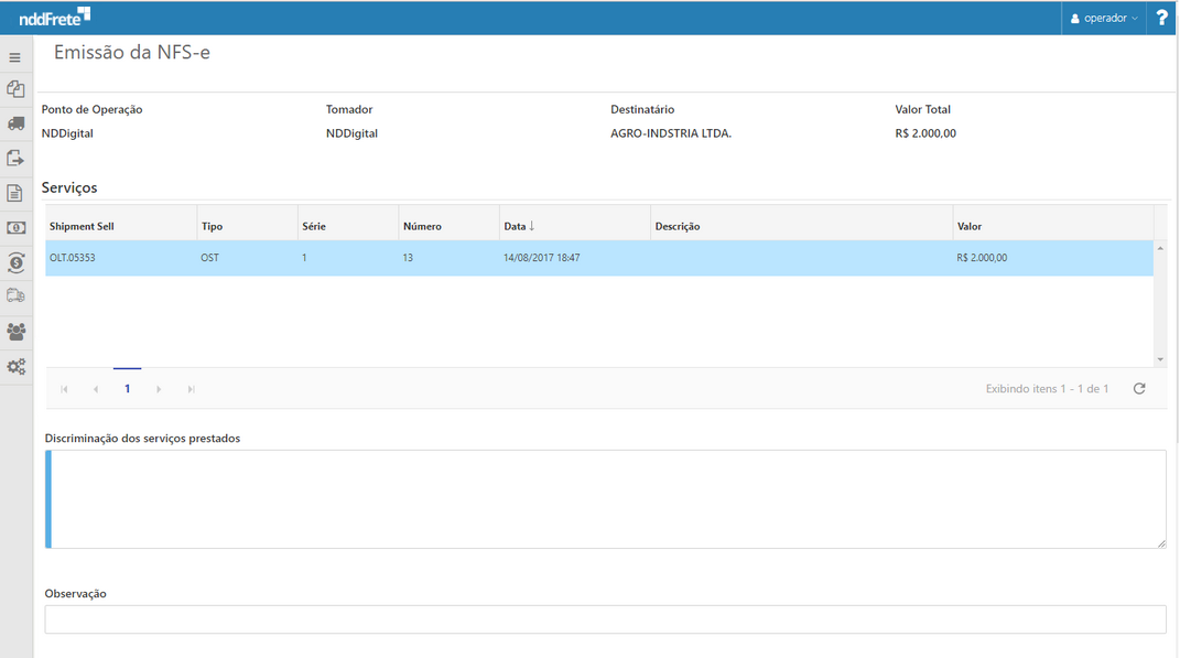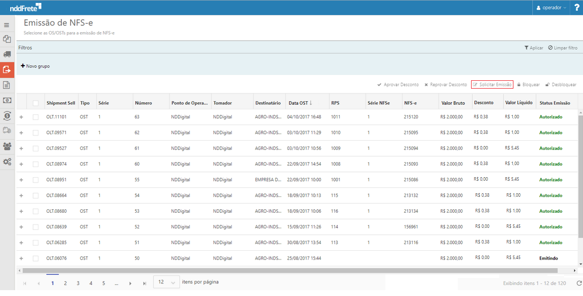 Através da tela de emissão de NFS-e, é possível visualizar as NFS-e OST disponíveis, para que possa solicitar a emissão de notas fiscais de serviço, onde as mesmas sejam integradas com as respectivas prefeituras. Disponível também o opções de bloqueio e desbloqueio de NFS-e para pagamento por motivo de sinistro de carga.
