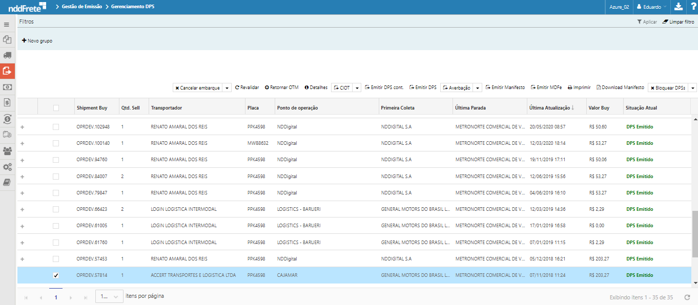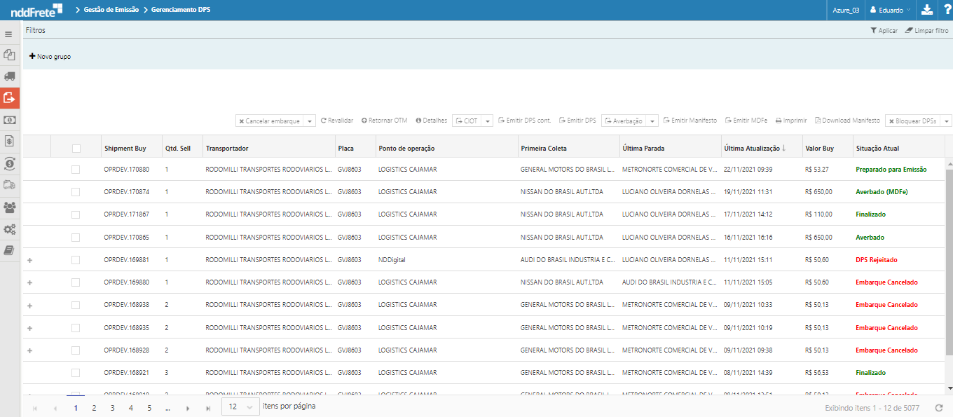 Na tela “Gerenciamento de emissão” é possível realizar a solicitação de emissão de DPS por meio do shipment buy.