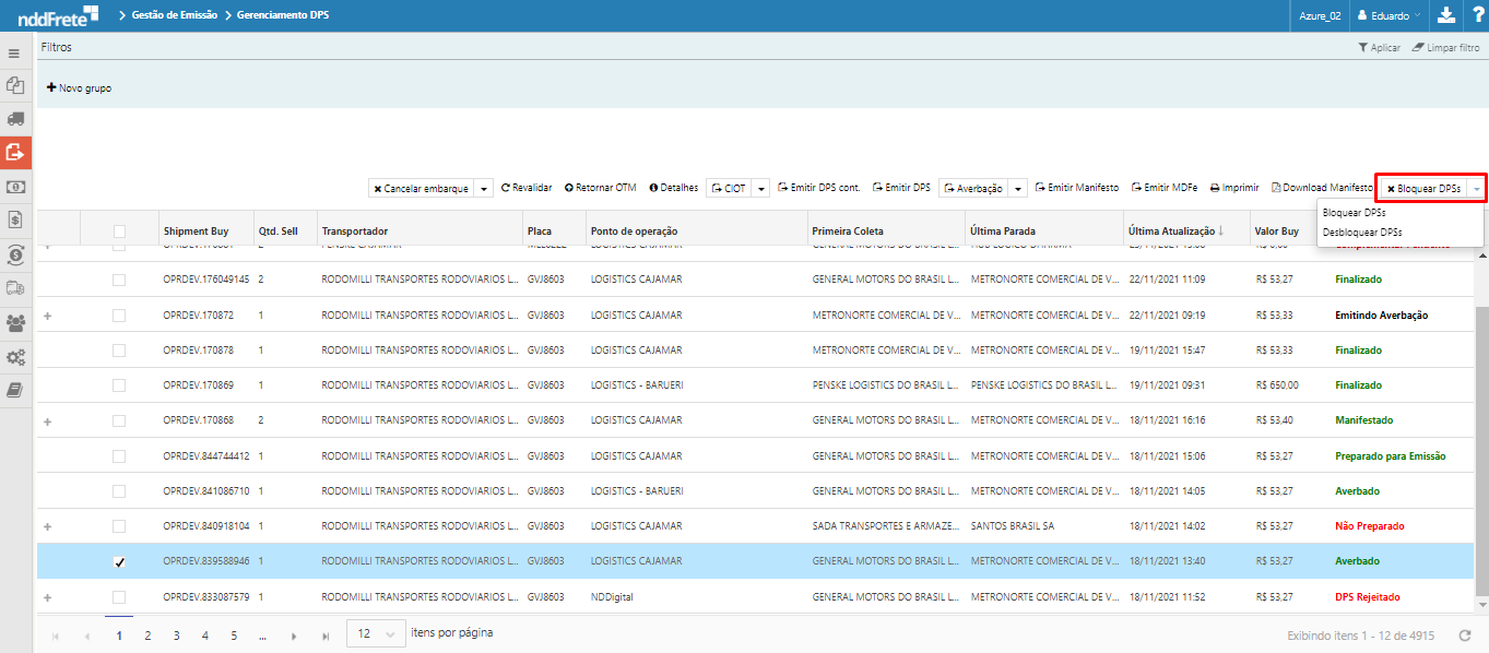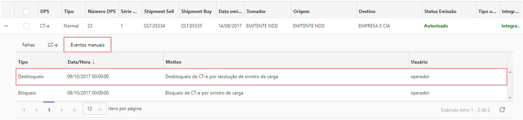 localizada acima da grid, permite realizar o bloqueio de DPSs por motivo de sinistro de carga, enquanto o CT-e não estiver em uma fatura fechada, estes podem ser bloqueados para pagamento.