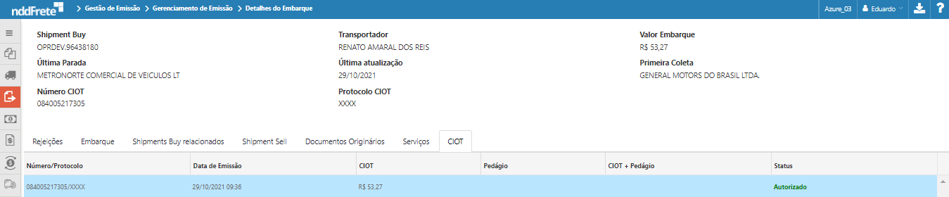 •CIOT - Apresenta o valor do frete, relacionados ao shipment buy em exibição.