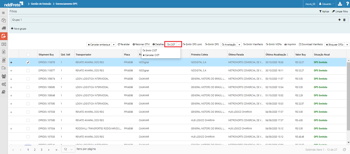 Pré requisito: Só será possível emitir CIOT para o embarque que tiver sua Situação Atual como: •Preparado para Emissão •DPS Cancelado •CIOT Cancelado •CIOT com falha |