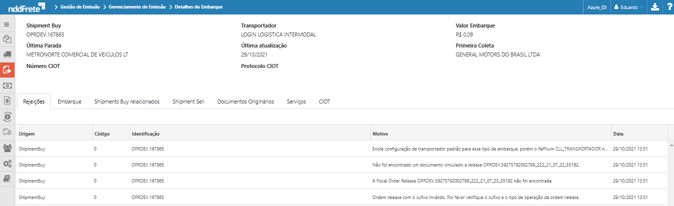Na tela de "Detalhes do Embarque" é possível visualizar os dados do embarque selecionado, assim como inconsistências, shipments buy, shipments sell e documentos originários relacionados a ele.