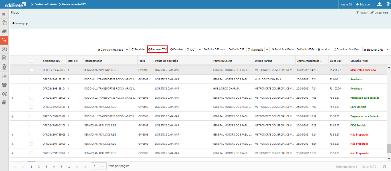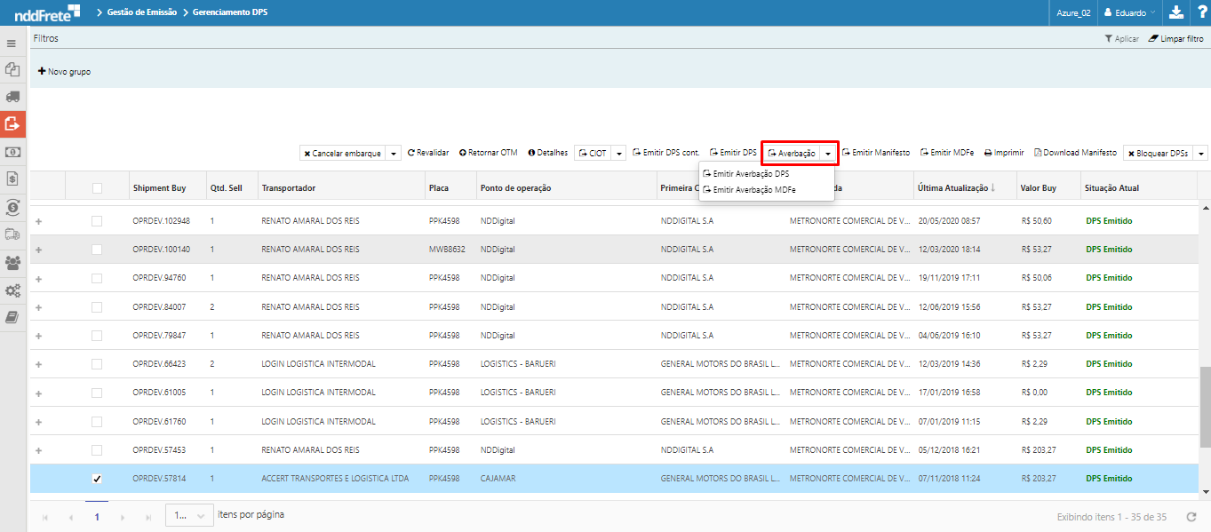•Emitir Averbação DPS: Realizar a averbação de seguro manual para os embarques com a situação atual igual a DPS Emitido, para CT-e e OST.