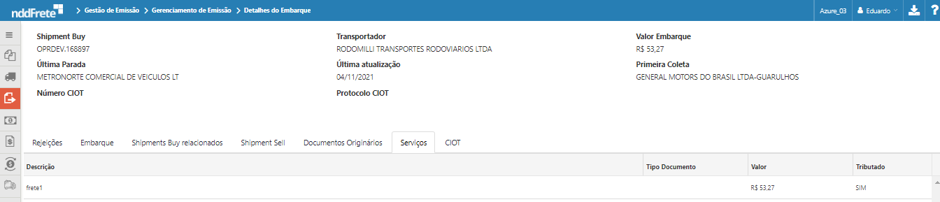 •Serviços - Apresenta a descrição do serviço que será prestado, relacionados ao shipment buy em exibição.