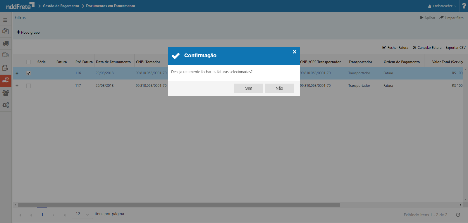 Ao clicar na ação "Validar" é exibido um pop-up de confirmação se deseja realmente fechar a fatura selecionada: