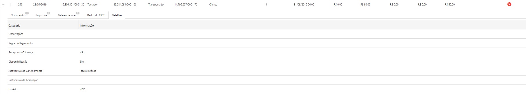 •CNPJ/CPF Transportador: CNPJ do transportador relacionado a fatura;