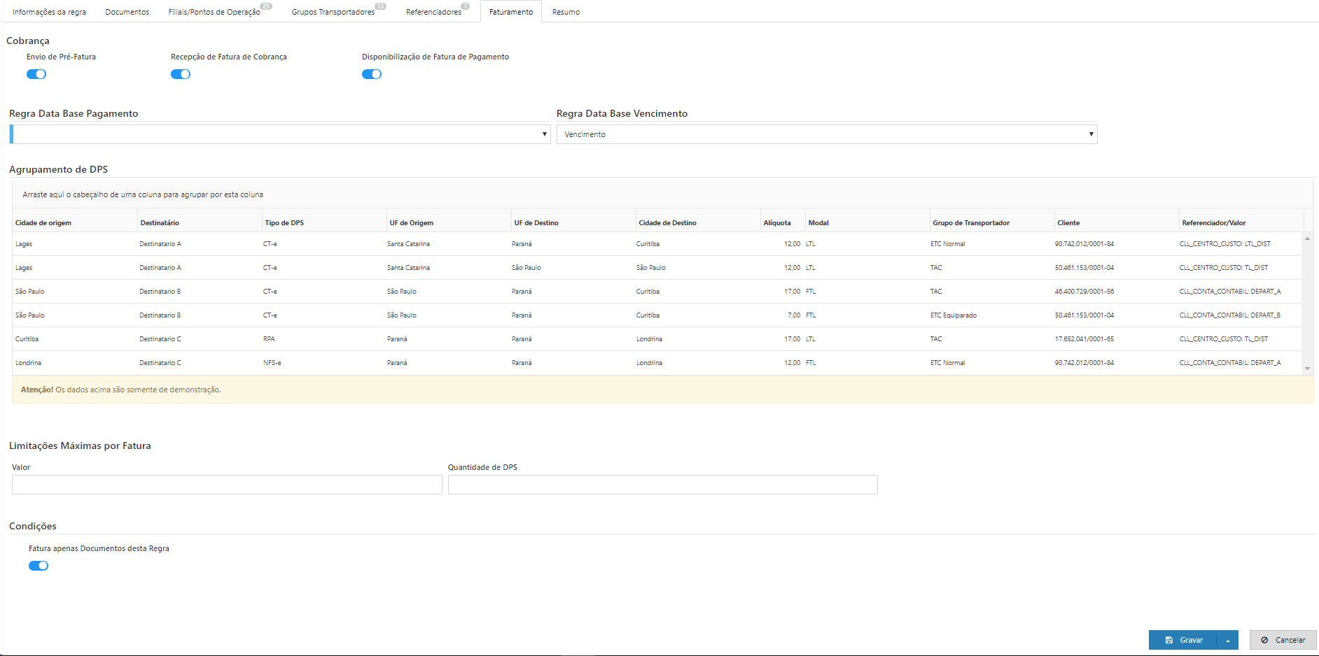 Quando agrupado por Grupo de Transportador, será criado a fatura com os DPSs dos transportadores vinculados ao Grupo, sendo assim é permitido faturas com mais de um transportador. A fatura deve respeitar o CNPJ de faturamento informado no Grupo, caso não possua um CNPJ , deverá criar faturas com CNPJ referente aos transportadores dos DPSs. |
