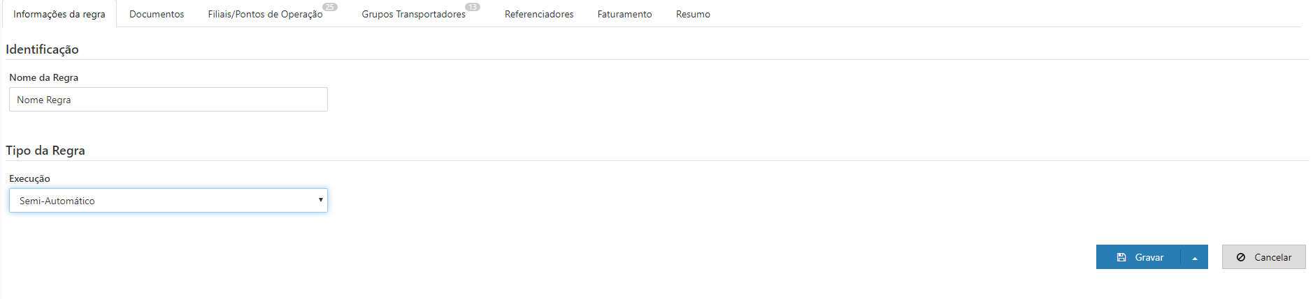 Não será possível adicionar duas regras com as mesmas configurações nos seguintes casos: •Grupo de transportadores e tipo de documentos; •Grupo de transportadores, tipo de documento e cliente; |