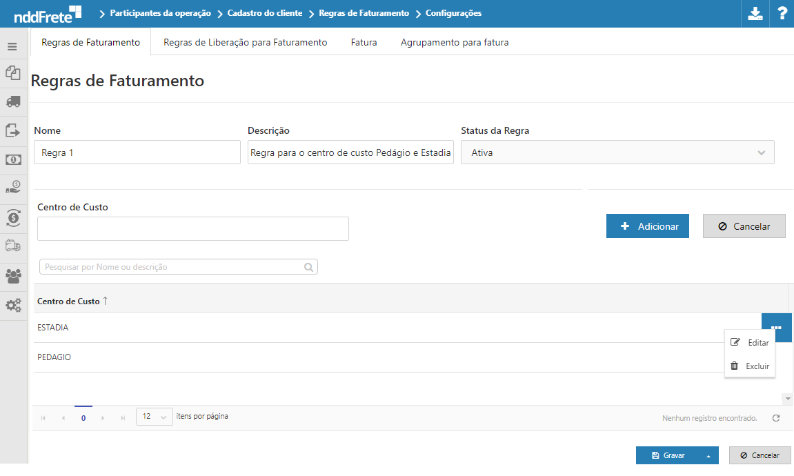Na aba "Regras de Fatuamento", deve ser informado um nome, e descrição para a regra, e se está será criada: ativa ou inativa, e informar quais "Centro de Custos" esta regra ira gerenciar;