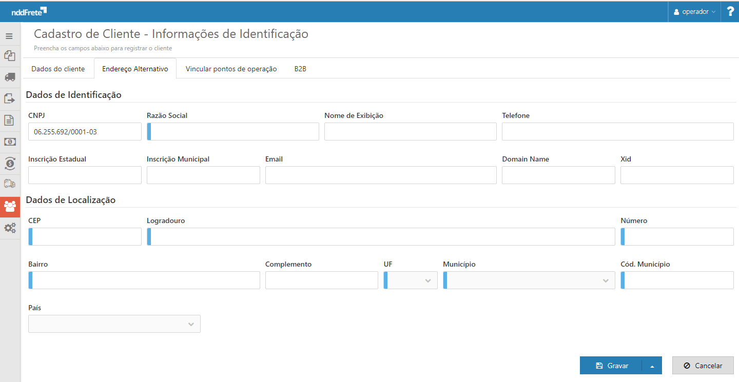 Caso o cliente possua outra empresa destinada a expedição logística, seus dados deveram ser informados na aba “Endereço Alternativo”.