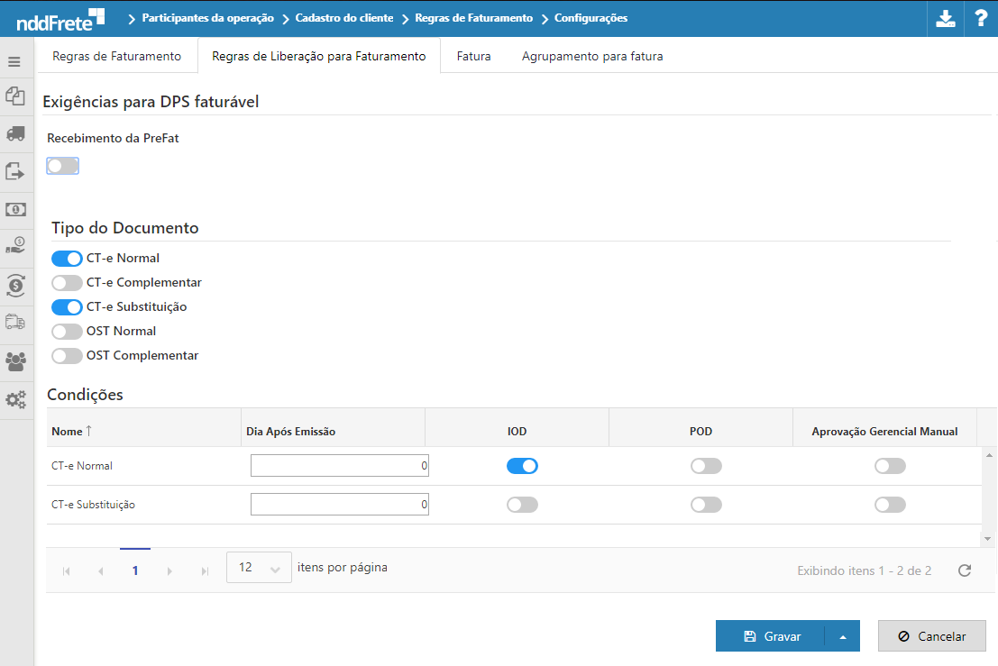 Com intuito de proporcionar maior organização e clareza no processo, o nddFrete disponibiliza dados demonstrativos, pré-cadastrados, para os DPSs faturáveis que irão compor a mesma fatura, na fase em faturamento.