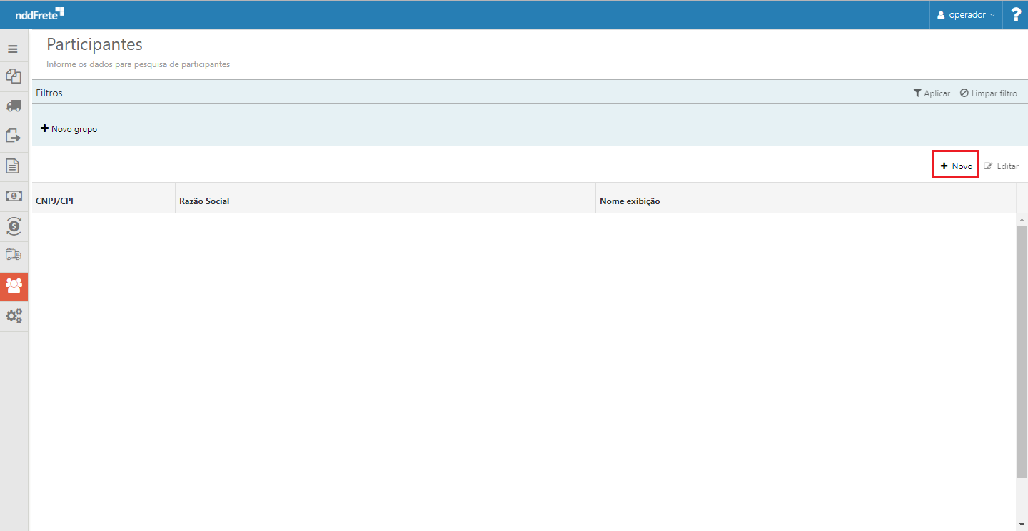 Para acessar a guia Cadastro de Participante navegue entre os menus: Principal>Participantes da Operação>Cadastro Participante