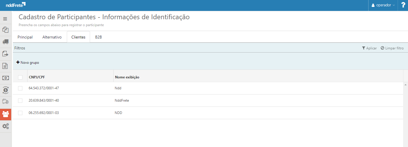 Na aba "Clientes" é realizado o vínculo entre o participante e os clientes cadastrados na aplicação nddFrete.