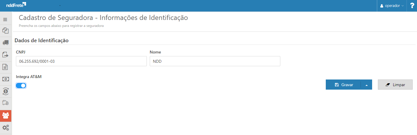 A seguir abrirá a tela para cadastro, então informe os Dados de identificação da seguradora: