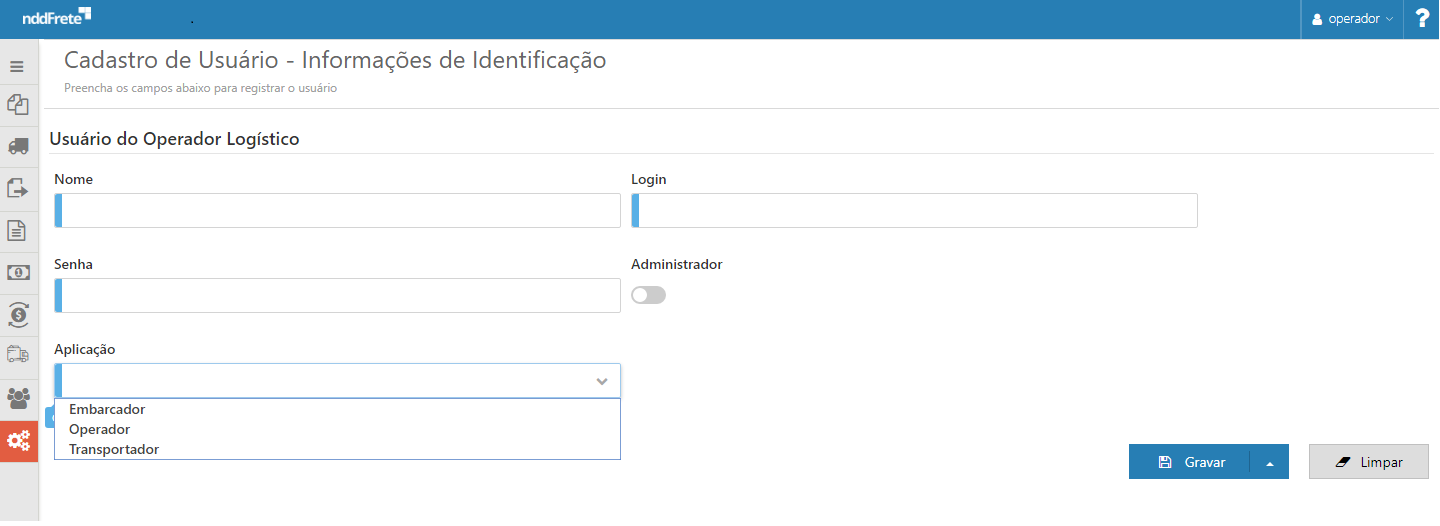 Ao selecionar Aplicação "Transportador" não será possível torna-lo administrador. Somente Aplicações do tipo "Operador", "Embarcador" podem ser administradores. |