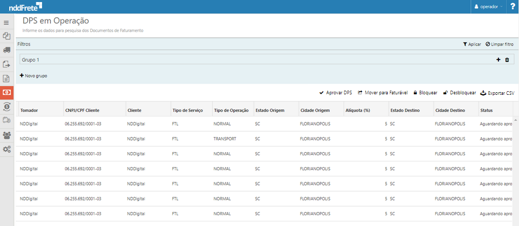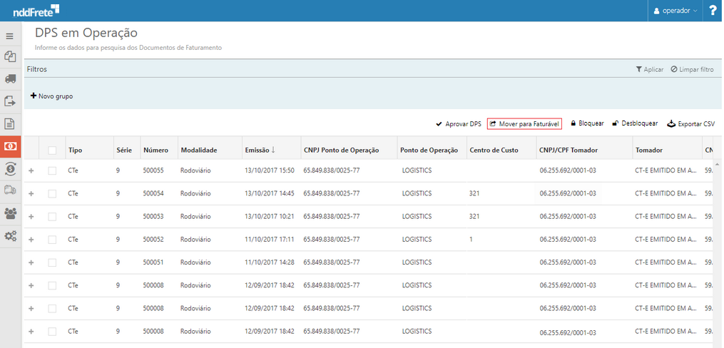 localizada acima da grid, permite realizar o bloqueio de DPS, enquanto o CT-e não estiver em uma fatura fechada, este pode ser bloqueado para Faturamento.
