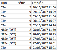 Na imagem acima foi realizada a exportação dos DPS faturável, das colunas selecionadas - Tipo, Série, e Emissão, levando em consideração a ordenação de forma decrescente da coluna emissão dos DPS. Resultando no seguinte arquivo CSV: