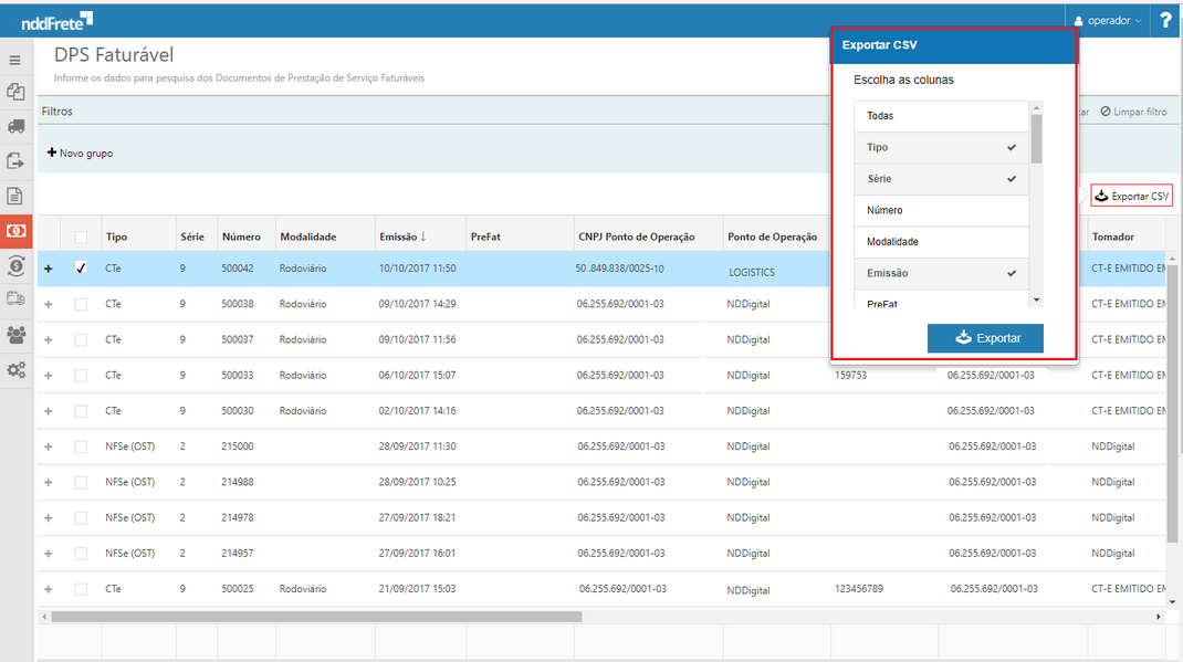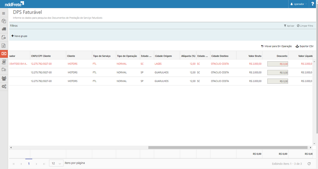 Após mover o DPS de em operação para faturável de forma manual ou automática, este é exibido na tela DPS faturável, onde será possível montar a fatura de forma manual pelo usuário conforme necessário, ou de forma automática de acordo com as regras configuradas por tipo de operação do cliente.