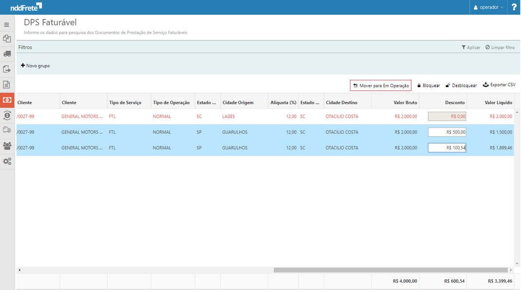 No final da grid é possível visualizar o valor total bruto, o valor total de desconto e o valor total líquido dos DPSs selecionados.