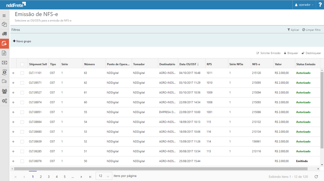 Através da tela de emissão de NFS-e, é possível visualizar as NFS-e OST disponíveis, para que possa solicitar a emissão de notas fiscais de serviço, onde as mesmas sejam integradas com as respectivas prefeituras. Disponível também o opções de bloqueio e desbloqueio de NFS-e para pagamento por motivo de sinistro de carga.