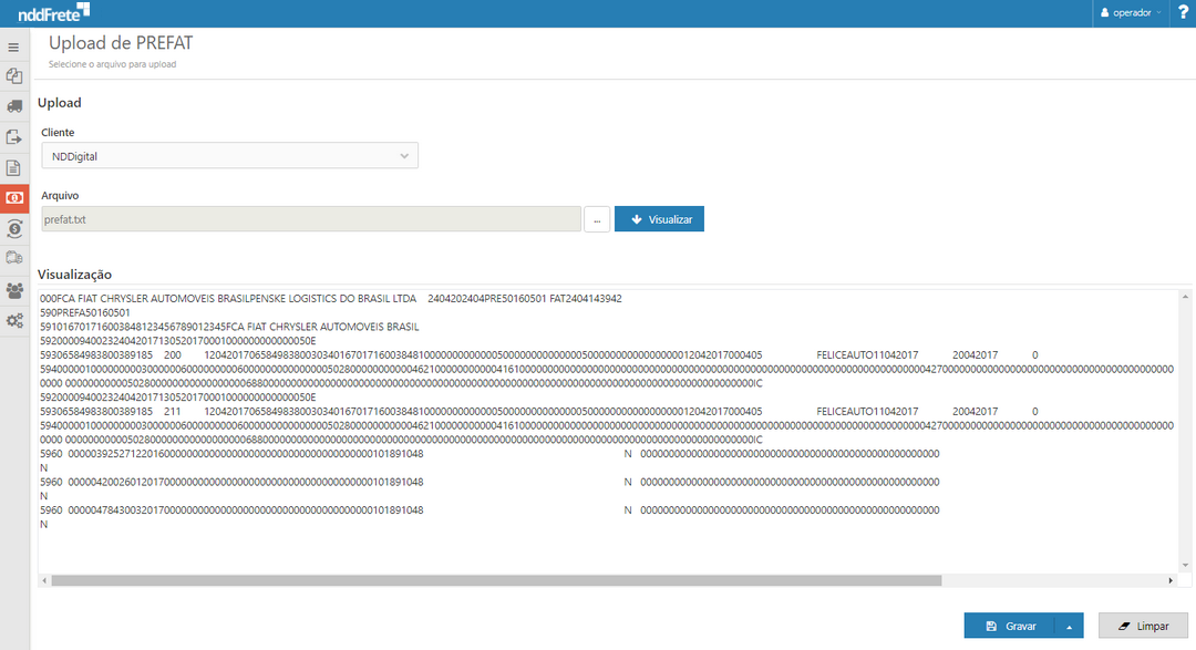 Através da tela de "Upload de PREFAT", é possível realizar upload do arquivo de pré fatura dos serviços gerado pelo cliente, que contém uma lista de documentos (Romaneios, CT-e) que podem ser faturados pelo responsável do transporte.