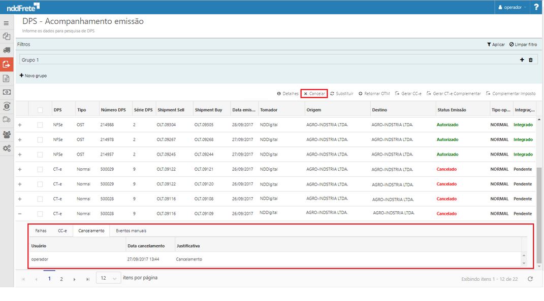 No detalhes da grid, a aba cancelamento exibe a justificativa, data e hora e o usuário que solicitou o cancelamento.