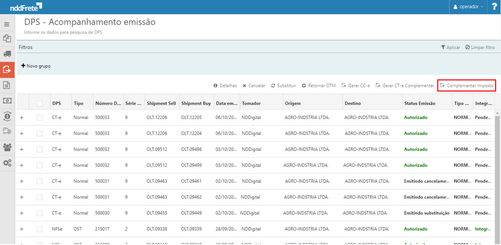 localizada acima da grid, permite solicitar a emissão de CT-e complementar de imposto.