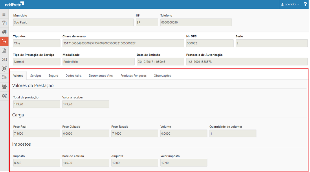 Na parte inferior da tela, exibe em abas os dados de valores da prestação, serviço, seguro, dados adicionais, documentos vinculados, produtos perigosos e observações.