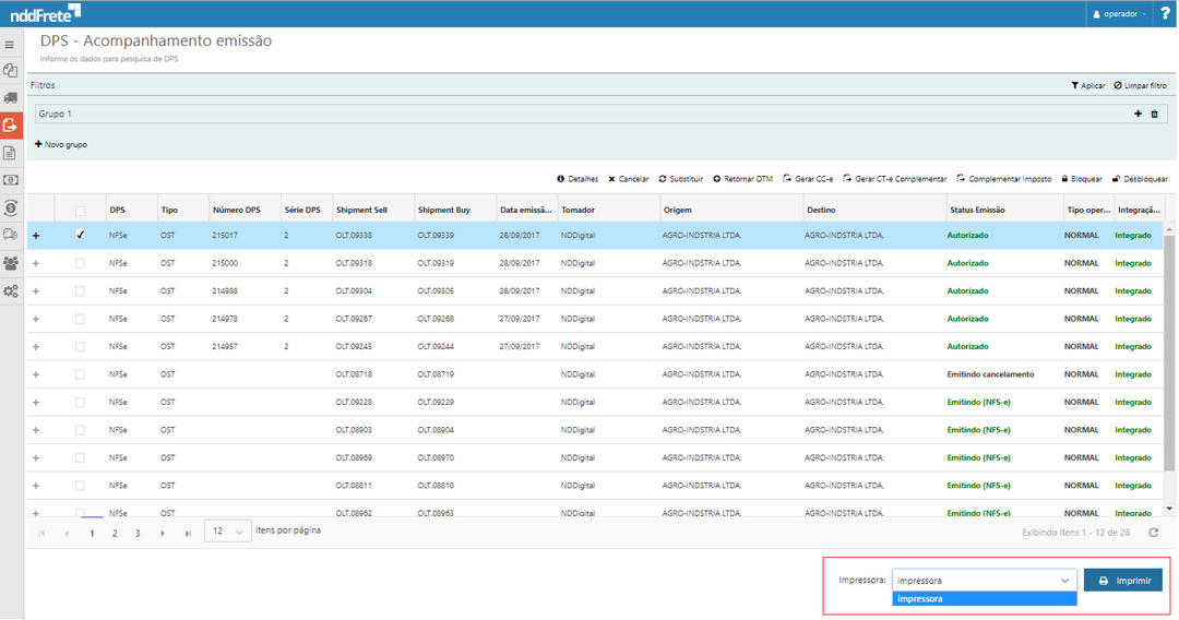 A impressora a ser seleciona é carregada do ponto de operação de cada documento. Caso selecionado múltiplos documentos, será determinado o ponto de operação de acordo com o primeiro registro selecionado.
