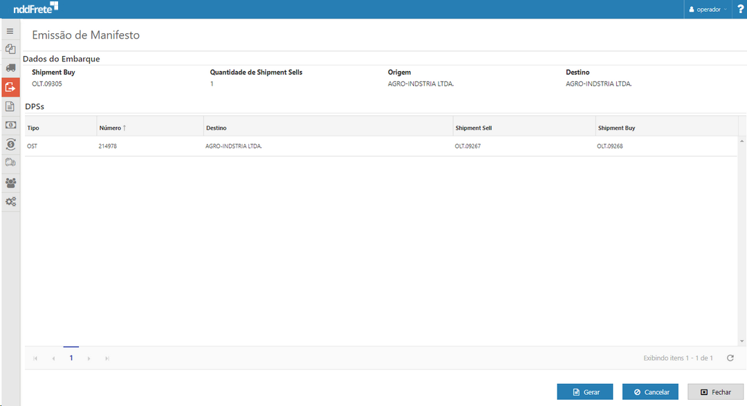 Ao clicar em detalhes do manifesto será redirecionado para seguinte tela para geração de manifesto: