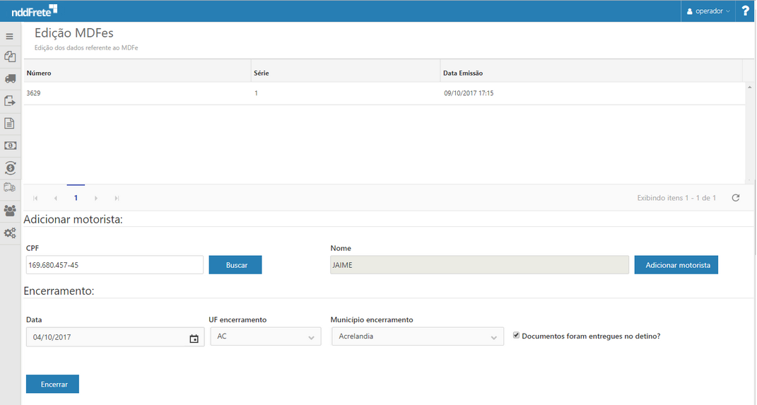 Em seguida acionar o botão adicionar motorista, para que este seja adicionado ao MDF-e.