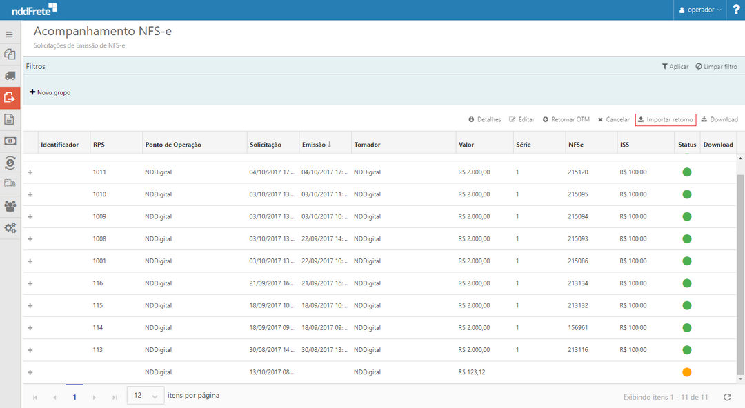 localizada acima da grid, permite importar manualmente o retorno da prefeitura que não possuir web service.