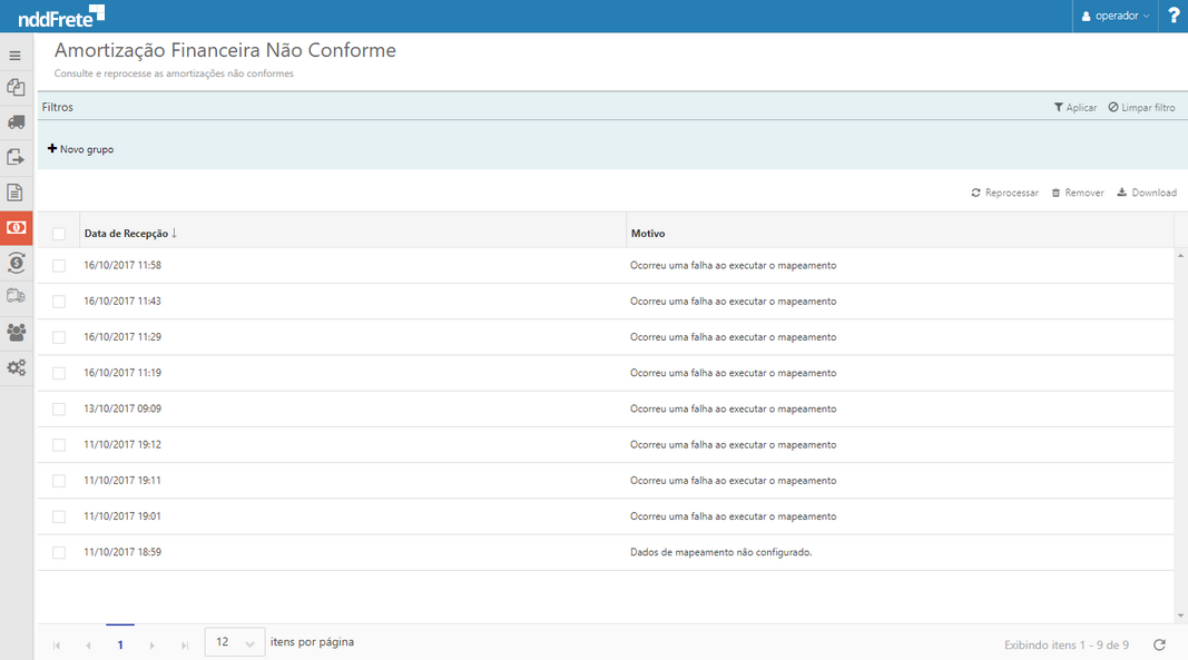 No monitoramento de amortizações não conforme, encontram-se os documentos recepcionados via web service, que não passaram pela validação de esquema no mapeamento.