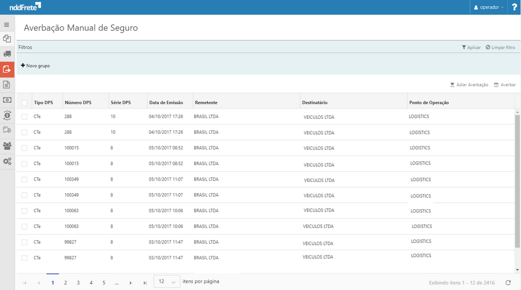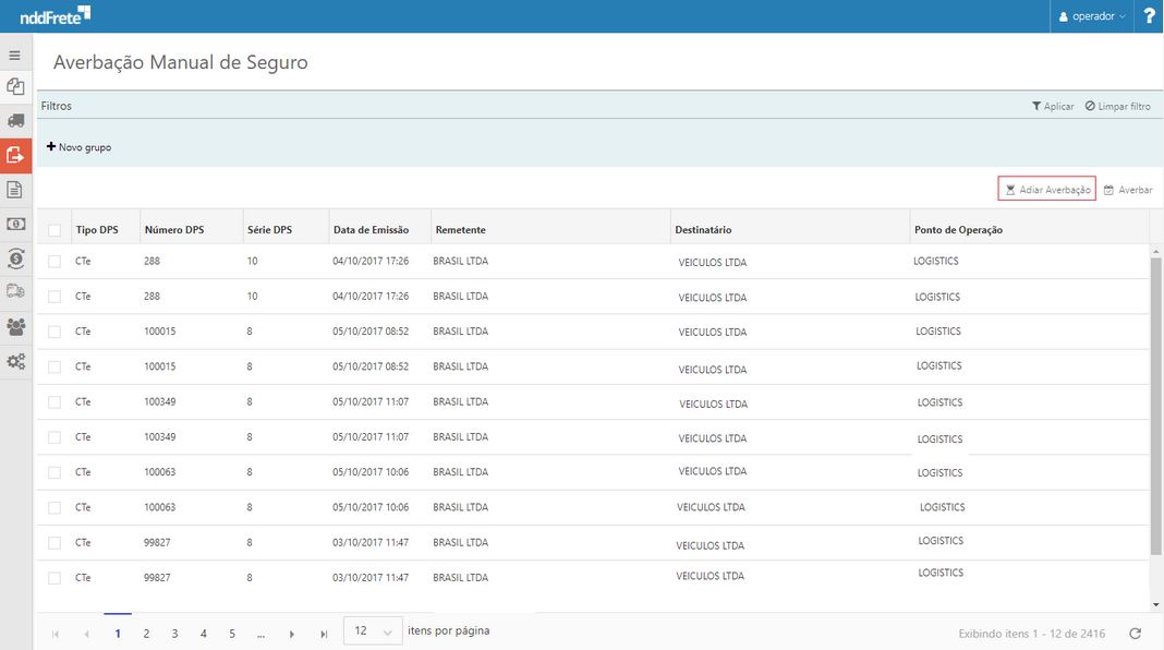 Através da tela de averbação manual de seguro, é possível acompanhar os DPSs que estejam configurados como agrupado nas "Configurações de emissão" do cadastro de cliente, para que possa adiar a averbação ou averbar.