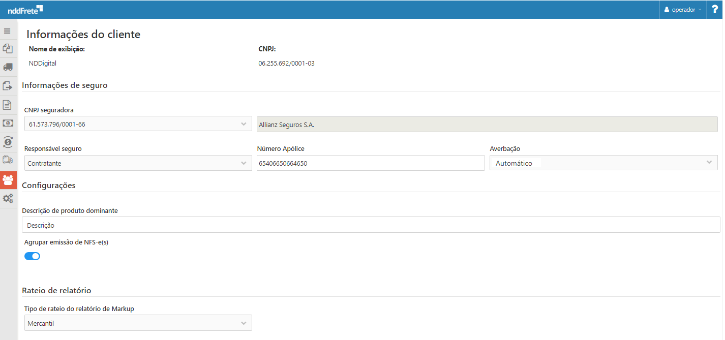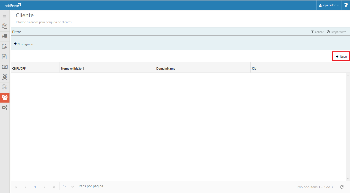 A guia “Cliente” contém as principais informações de todos os contratantes de serviços logísticos, cadastrados no nddFrete.