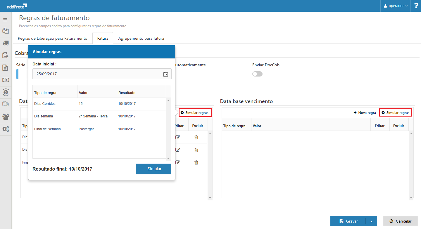 Com intuito de proporcionar maior organização e clareza no processo, o nddFrete disponibiliza dados demonstrativos, pré-cadastrados, para os DPSs faturáveis que irão compor a mesma fatura, na fase em faturamento.