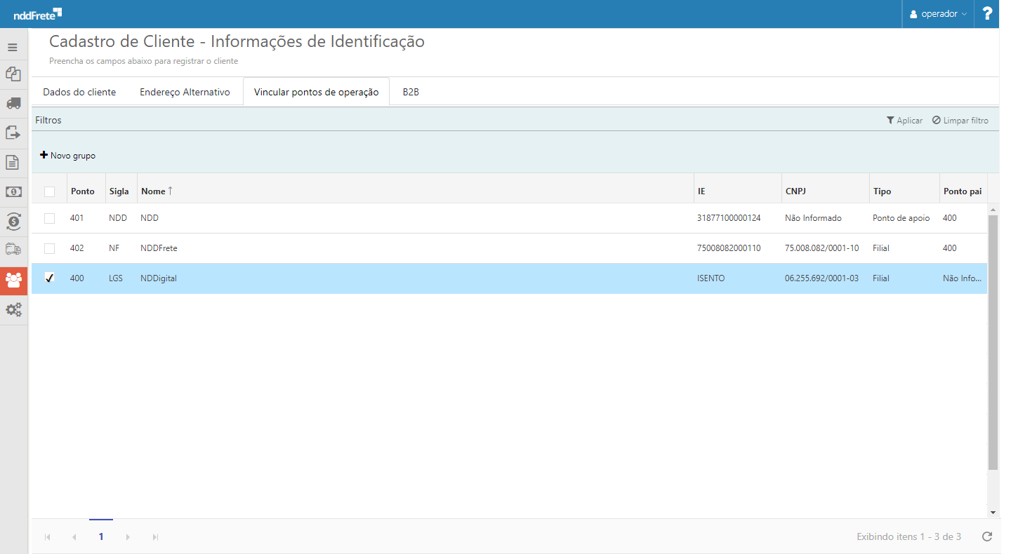 Na aba "Vincular pontos de operação", deve-se vincular o cliente com um ou mais Pontos de Operação, para que identifique em qual filial, ponto de apoio ou representante, o cliente opera.