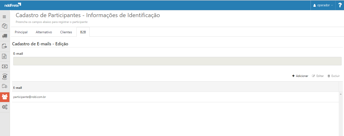 O endereço eletrônico do participante poderá ser informado na aba “B2B”, através dessa informação serão encaminhados para o destinatário do e-mail (participante) uma cópia da autorização de cada documento, bem como seus eventos (carta de correção, complementar, substituição e anulação) ou cancelamento.