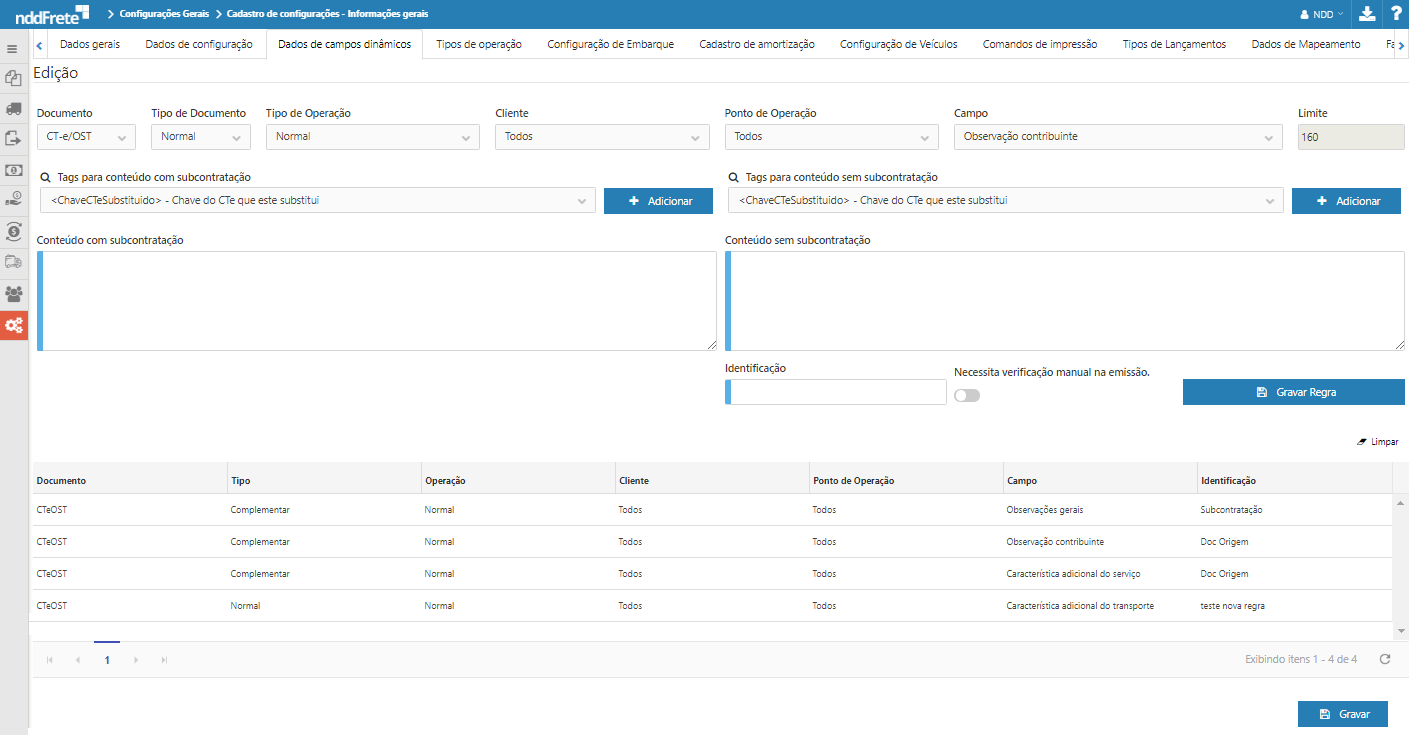 Algumas informações podem ser consideradas relevantes no processo de emissão de DPS para determinado cliente, ponto de operação entre outros. Dessa forma a aplicação nddFrete disponibiliza a aba “Dados de campos dinâmicos” para configuração de parâmetros pertinentes a emissão.