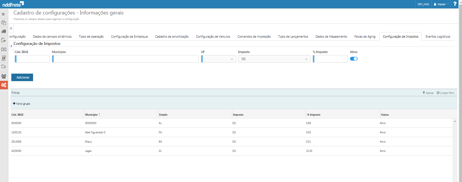 Na aba “Configuração de Impostos” são cadastrados os impostos que iram incidir sobre o documento, com base no município da operação logística. Para isso basta informar: