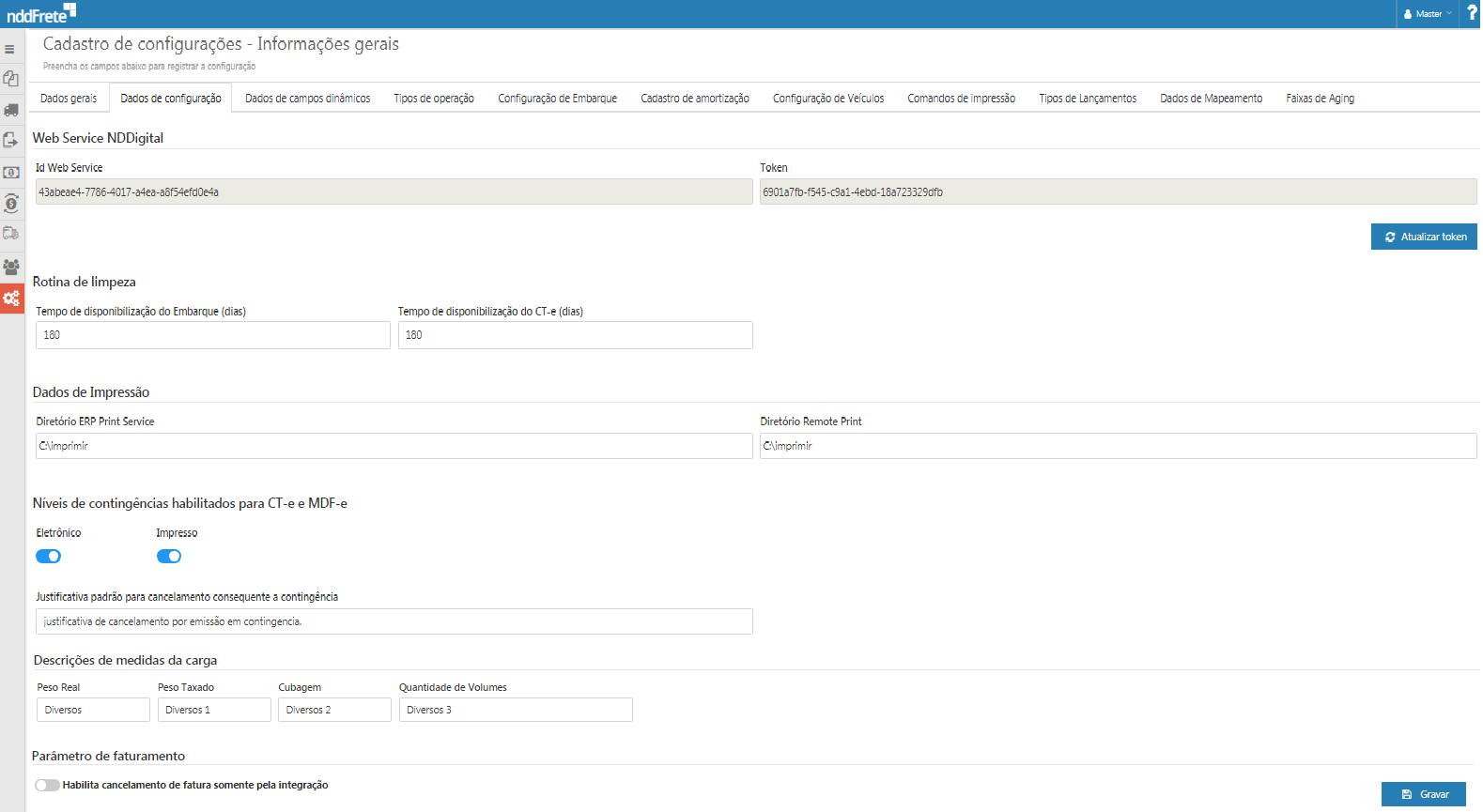 Na aba “Dados de configurações”, estão disponíveis as configurações para consultas via web service NDD, rotinas de limpeza de disponibilização, configuração de diretórios para impressão, habilitadores de contingência, descrição da carga e parâmetros de faturamento.